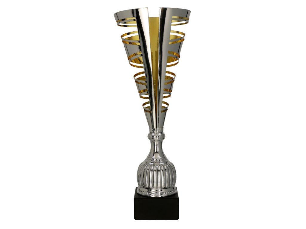 Moderní kovová trofej ve stříbrném provedení se zlatými prvky představuje stylové ocenění pro všechny typy soutěží a slavnostních příležitostí. Její unikátní konstrukce s otevřenými výřezy a spirálovými detaily dodává trofeji dynamický a luxusní vzhled, který skvěle vynikne při každém předávání cen. Díky kombinaci lesklého stříbra a zlatého vnitřního akcentu působí kovová trofej velmi reprezentativně a elegantně. Tento typ designu je typický pro moderní sportovní trofeje, které kladou důraz na originalitu a vizuální efekt. Kovová trofej je usazena na pevném podstavci, který zajišťuje stabilitu a zároveň nabízí prostor pro umístění štítku s textem nebo věnováním.