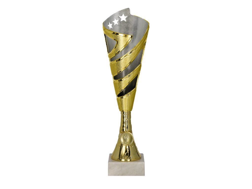 Tato zlatá trofej zaujme na první pohled svým dynamickým designem doplněným o motiv hvězd, který jasně odkazuje na vítězství a výjimečný výkon. Kombinace zlatých prvků a jemné struktury ve stříbrném pozadí vytváří atraktivní kontrast, díky kterému plastová trofej působí moderně a zároveň slavnostně. Tvar trofeje působí vzestupně a symbolicky tak připomíná cestu na vrchol – přesně ten moment, kdy se úsilí mění ve vítězství. Díky tomu je ideální pro sportovní soutěže, školní akce i jiné příležitosti, kde chcete ocenit ty, kteří zazářili. Stabilní podstavec zajišťuje pevnost a dodává trofeji důstojný základ. Celek působí vyváženě, výrazně a připraveně stát se viditelnou odměnou za skvělý výkon.