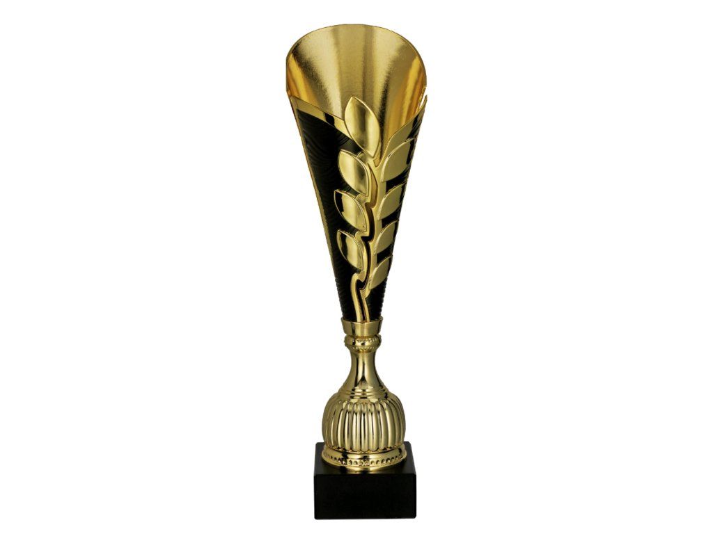 Plastová trofej, která působí jako designový artefakt spíš než klasická cena. Kombinace hluboké černé a lesklého zlata vytváří silný kontrast, který okamžitě přitahuje pozornost. Dominantní silueta je štíhlá, sebevědomá a moderní. Zlatý motiv listu vystupuje z tmavého pozadí a působí téměř jako reliéf – elegantní detail, který dává trofeji charakter a styl. Celkový dojem je odvážný, ale zároveň vkusný. Není přeplácaná, ale rozhodně není nenápadná. Přesně ten typ ocenění, který si člověk vystaví, ne odloží. Pokud tedy hledáte něco opravdu výjimečného, právě takhle plastová trofej bude trefou do černého.